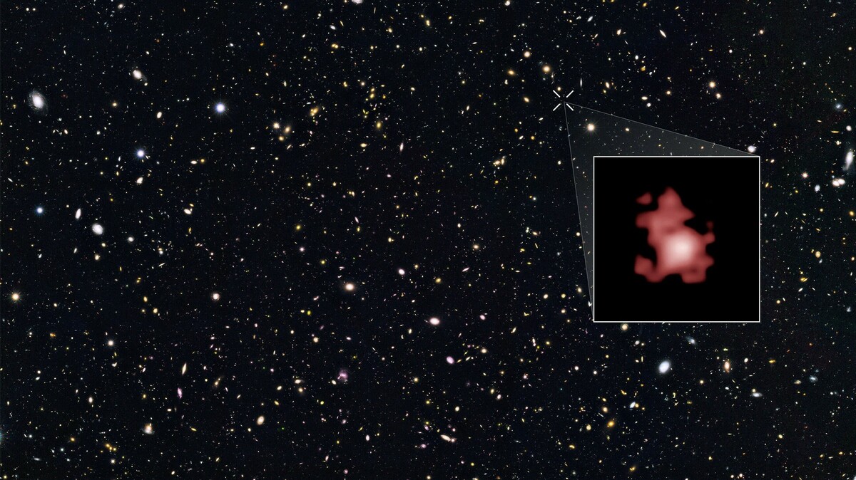 This picture exhibits a “close-up” of the galaxy GN-z11 as imaged by the Hubble House Telescope, superimposed on one other picture that marks the placement of the galaxy within the sky.